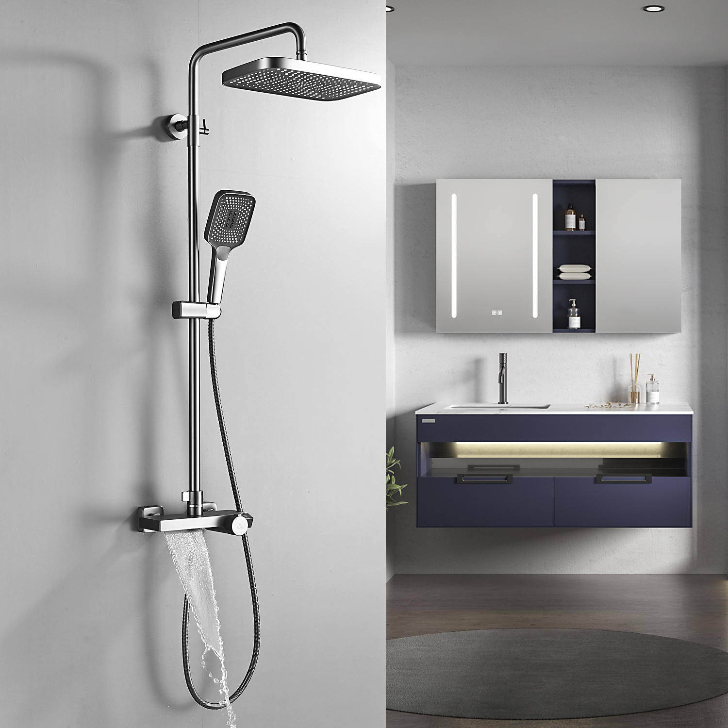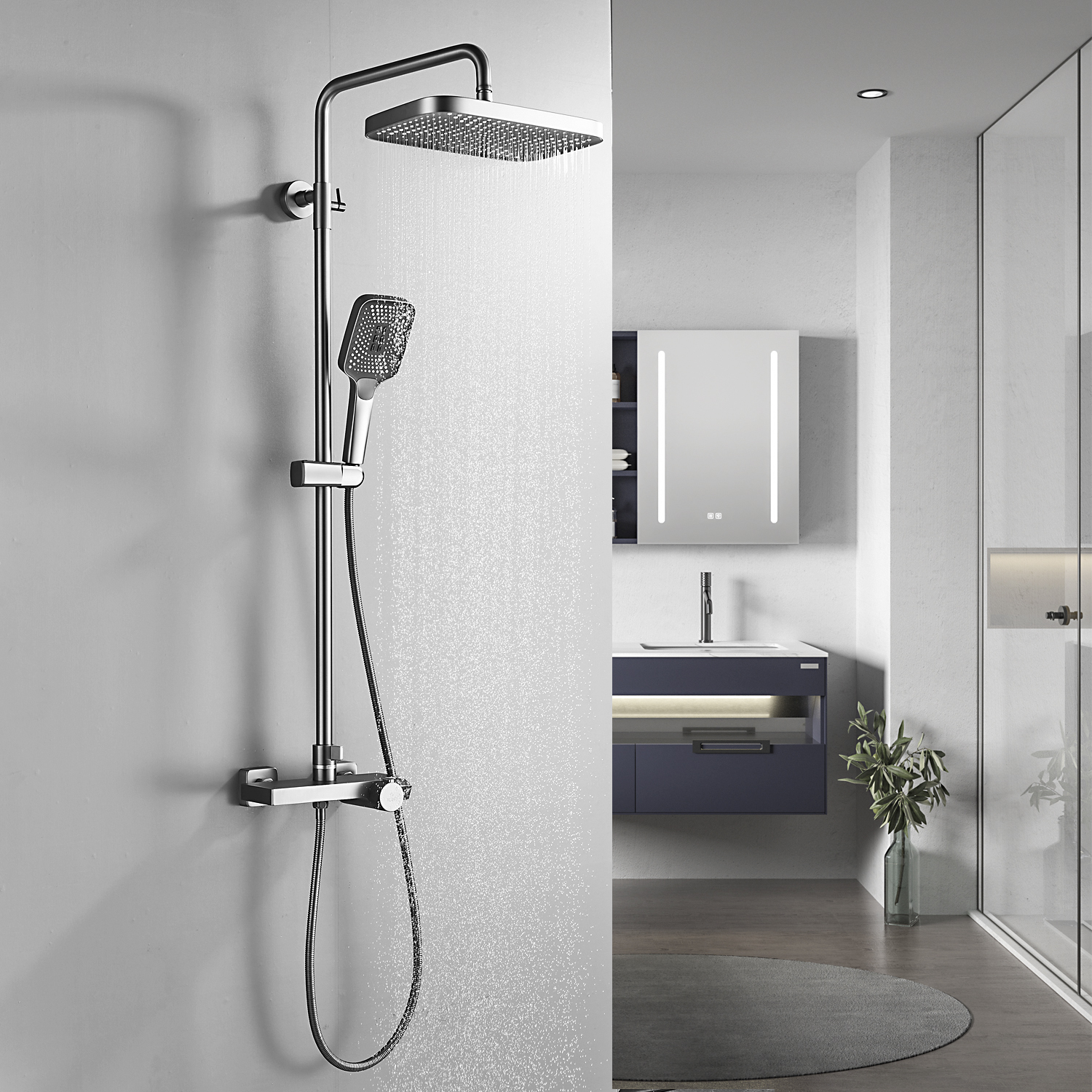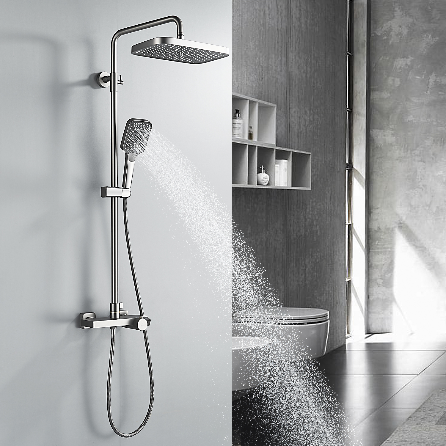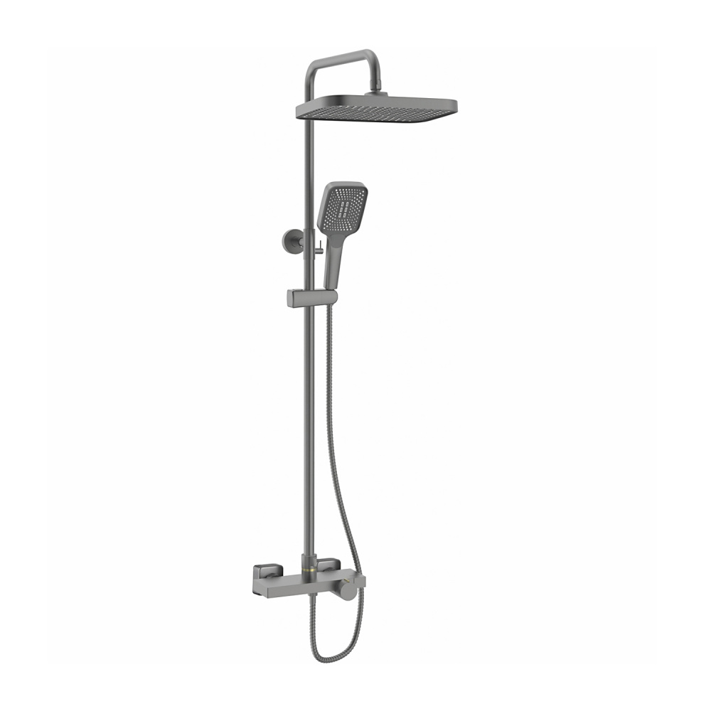 Комплектация | смеситель, душевая стойка, верхний душ, душевая лейка, душевой шланг, держатель для душевой лейки, настенный держатель, отражатели, эксцентрики |