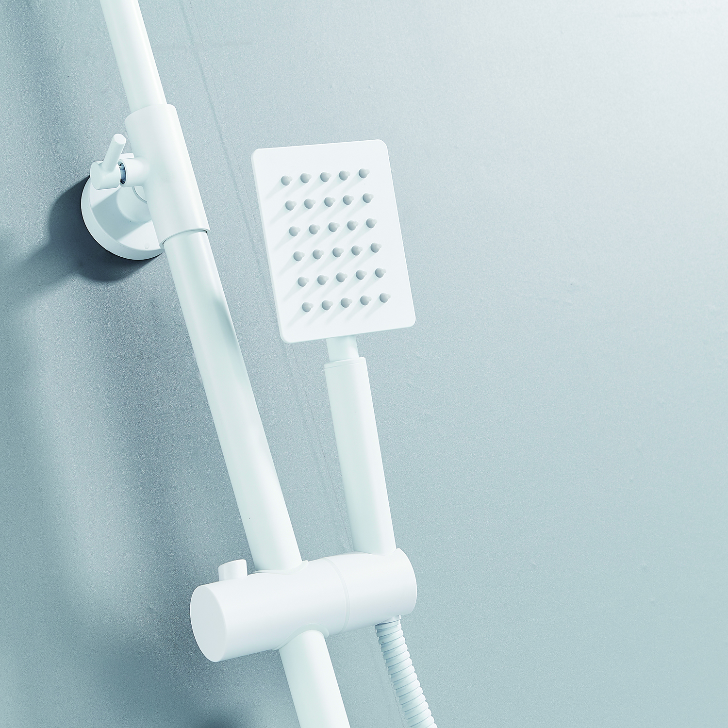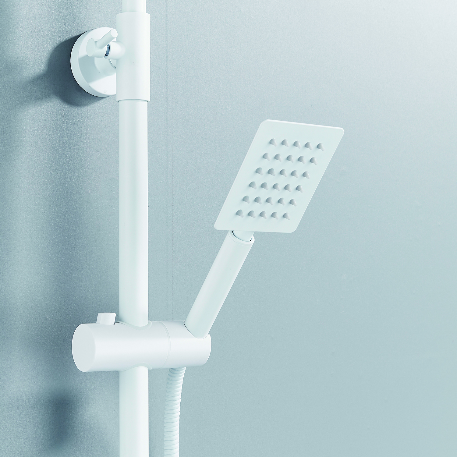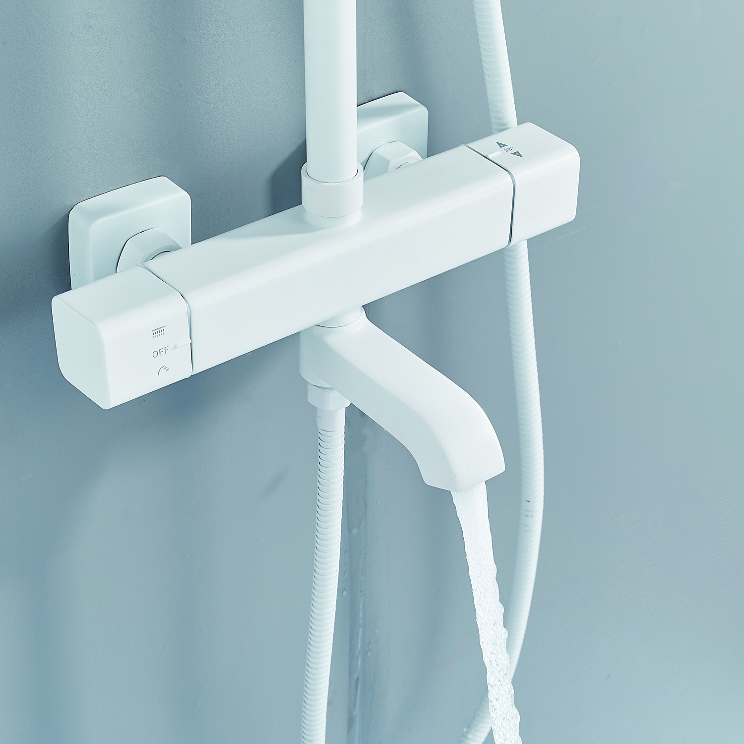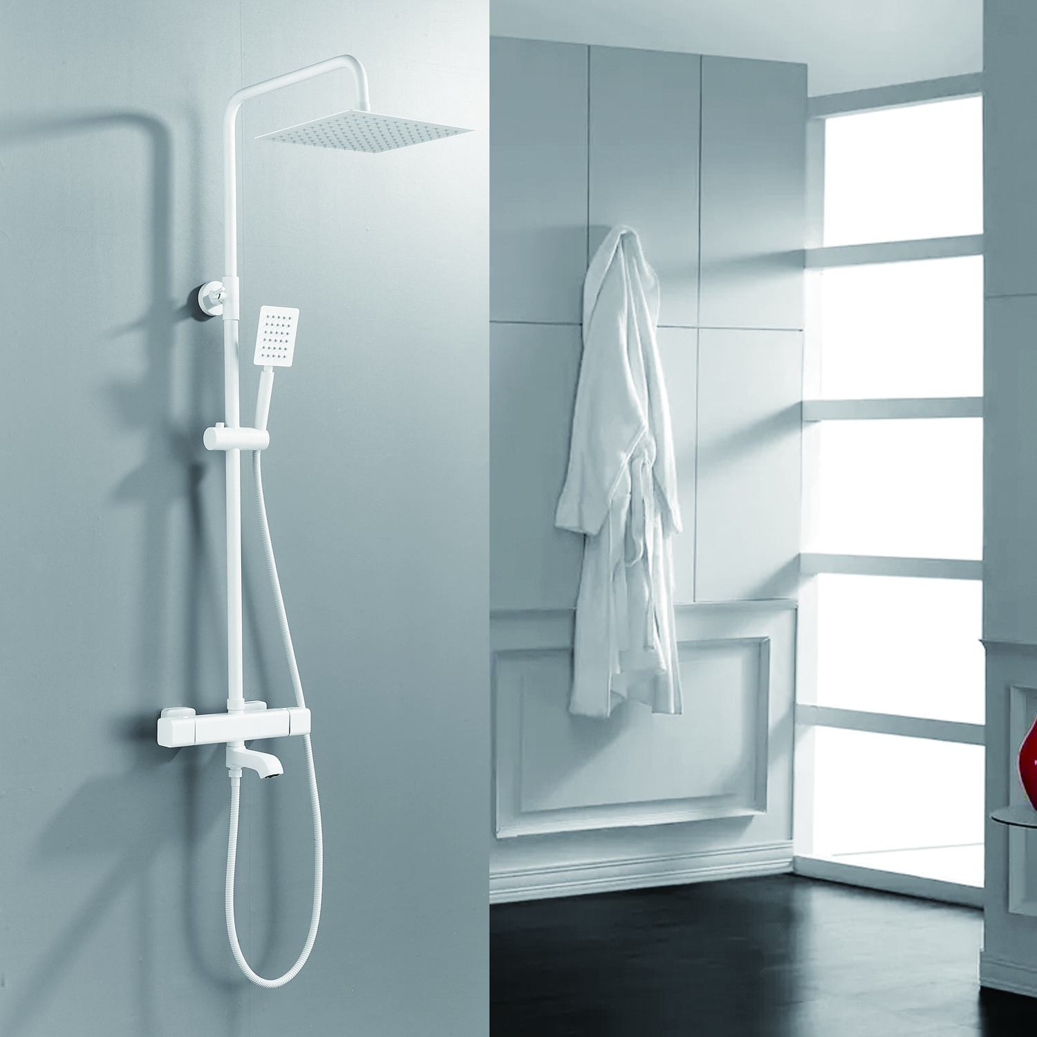 | Комплектация | смеситель, душевая стойка, верхний душ, душевая лейка, душевой шланг, держатель для душевой лейки, настенный держатель, отражатели, эксцентрики |