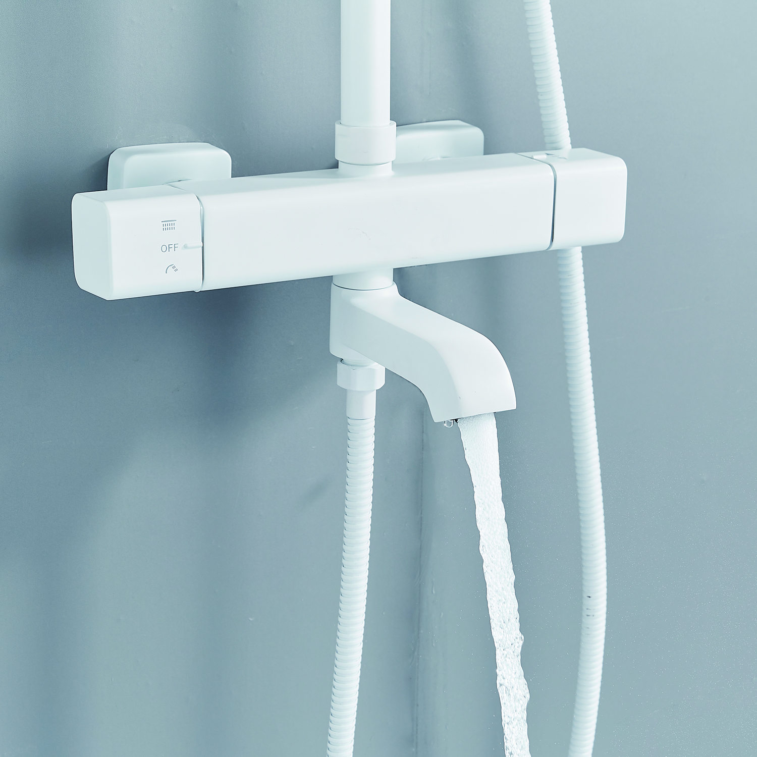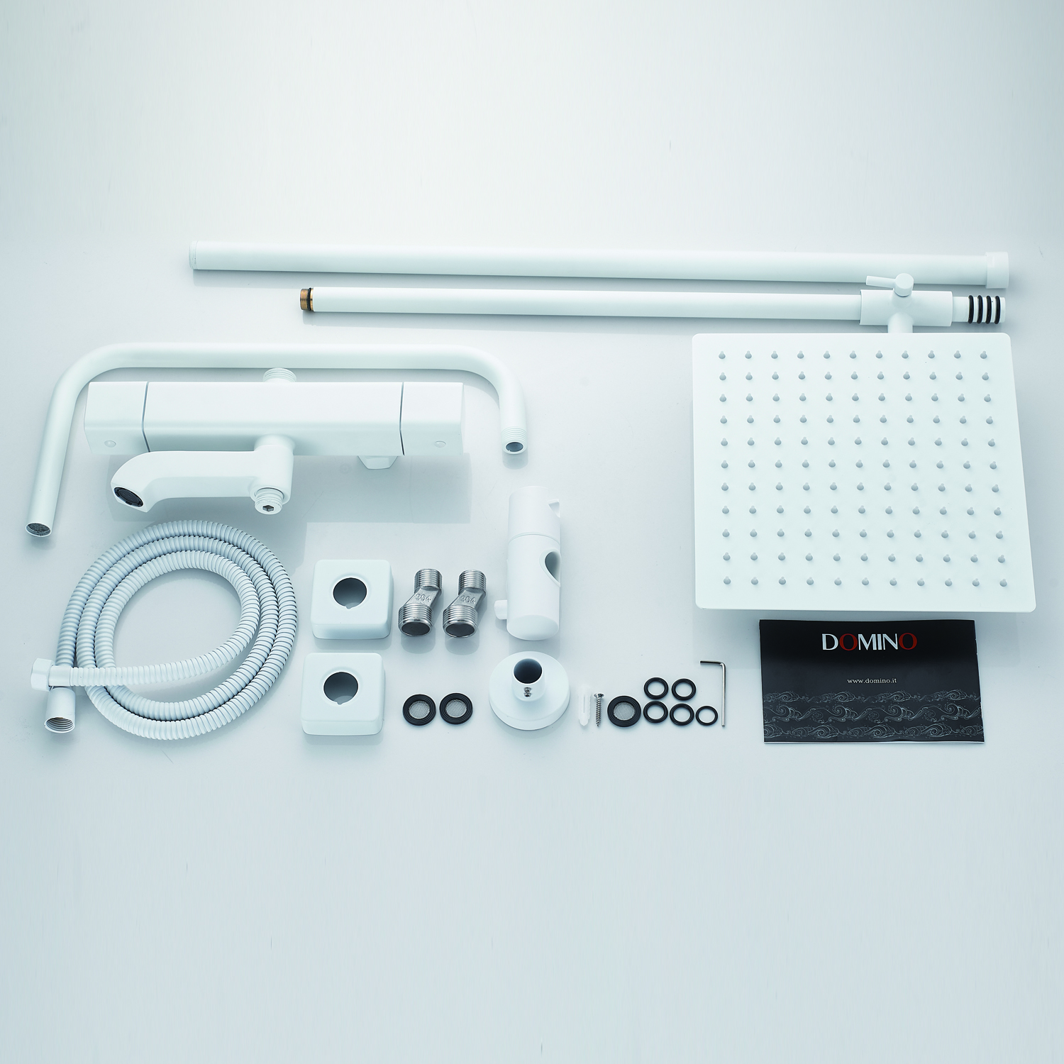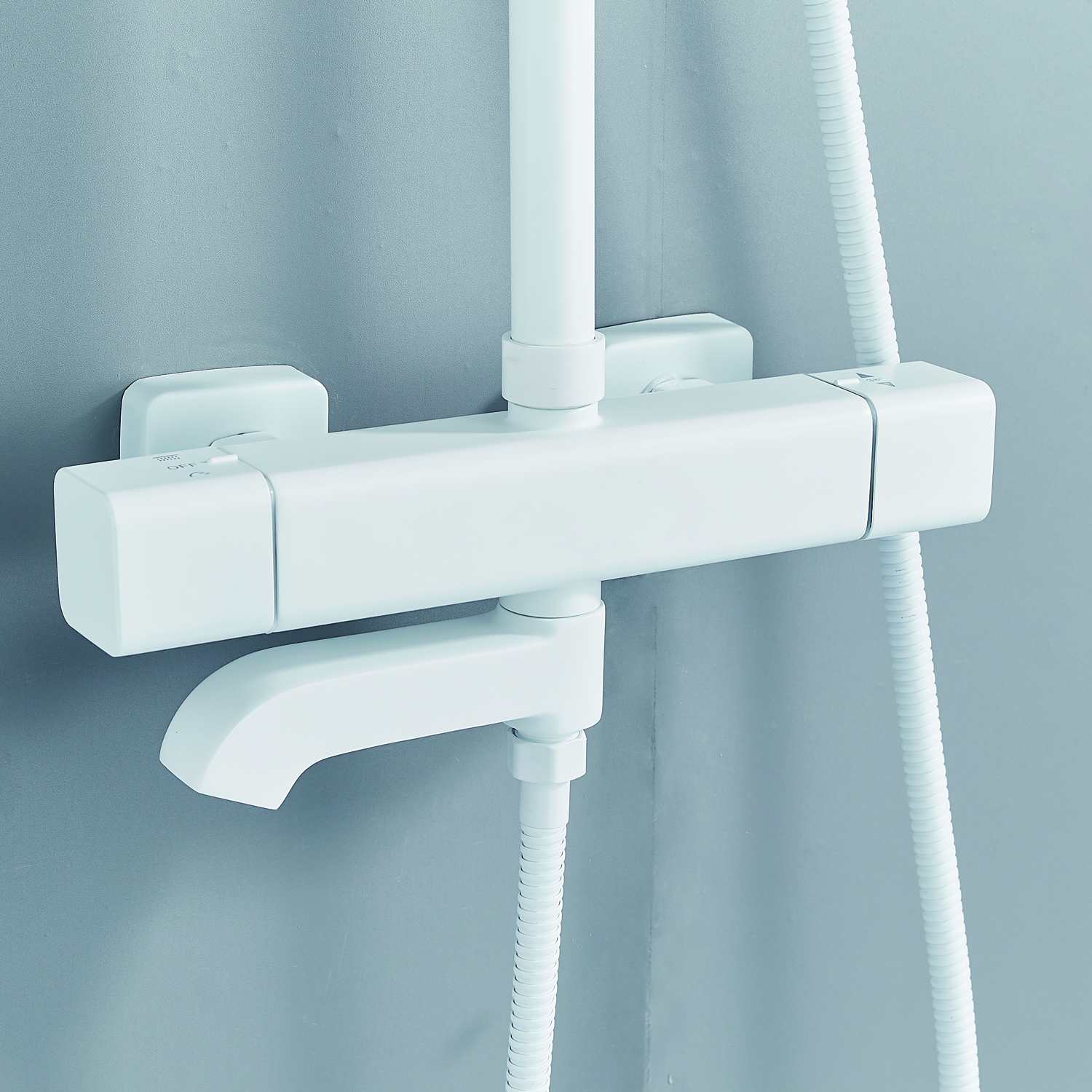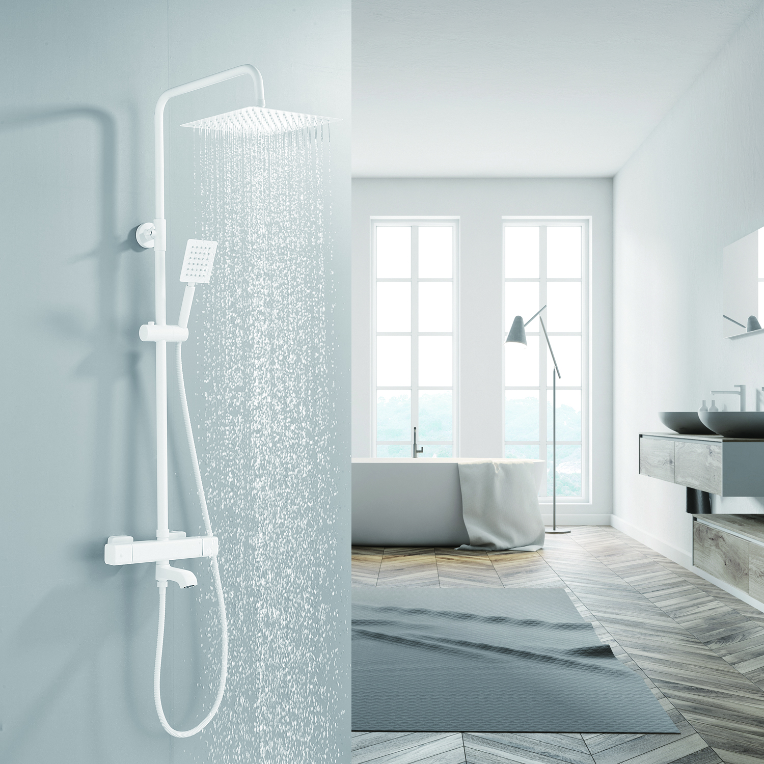 | Комплектация | смеситель, душевая стойка, верхний душ, душевая лейка, душевой шланг, держатель для душевой лейки, настенный держатель, отражатели, эксцентрики |