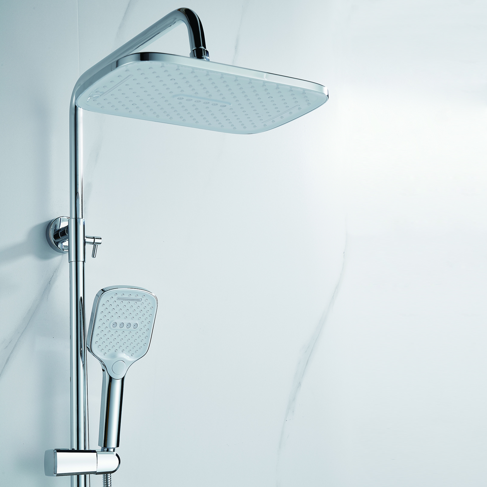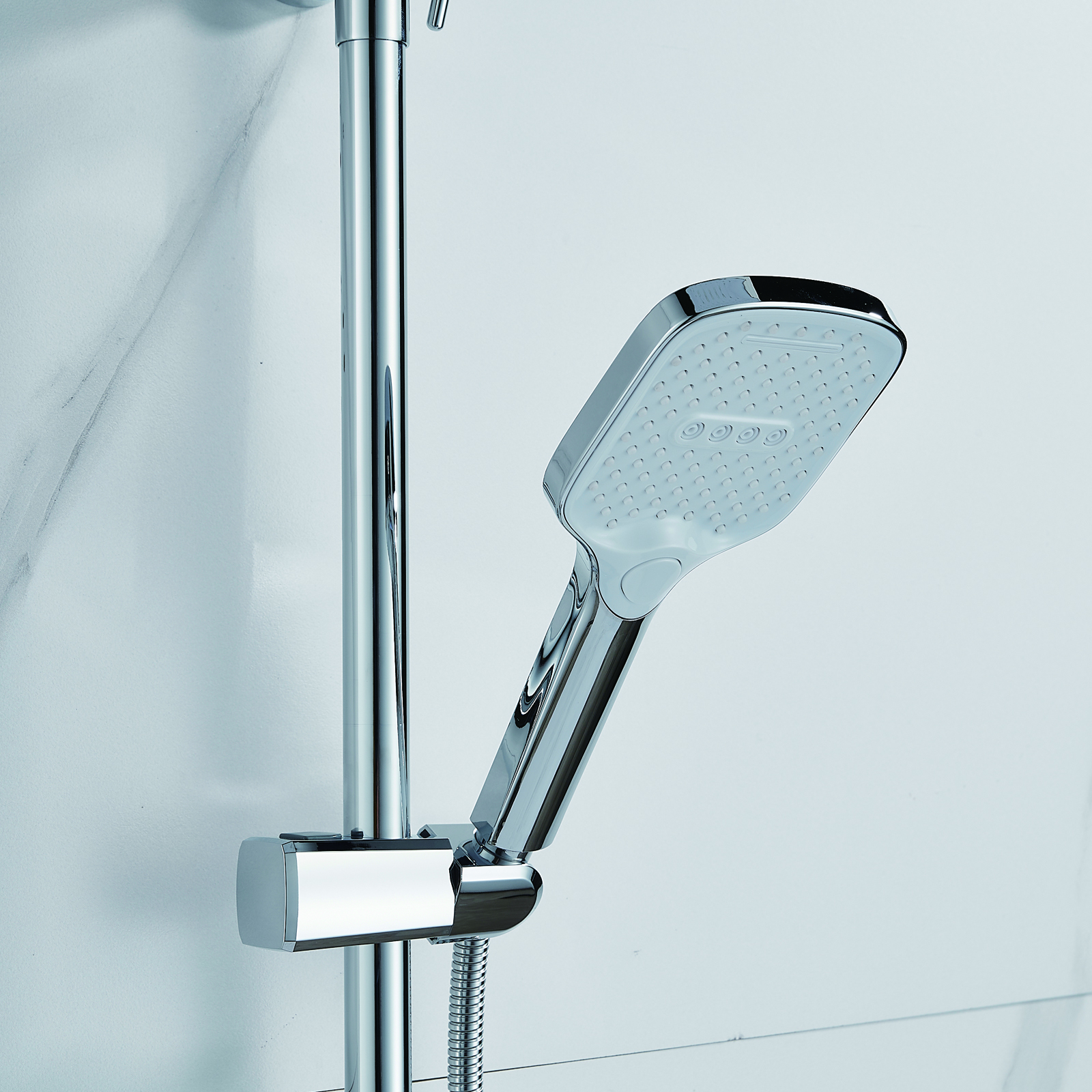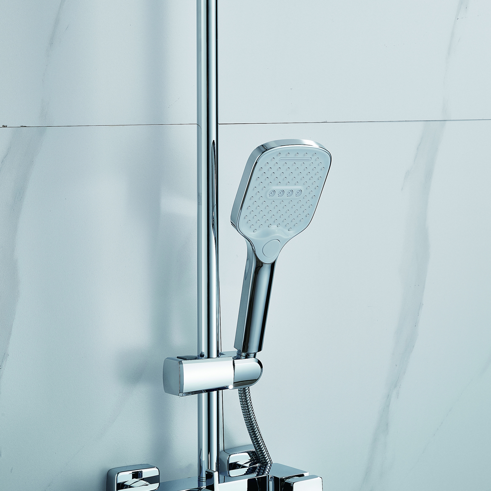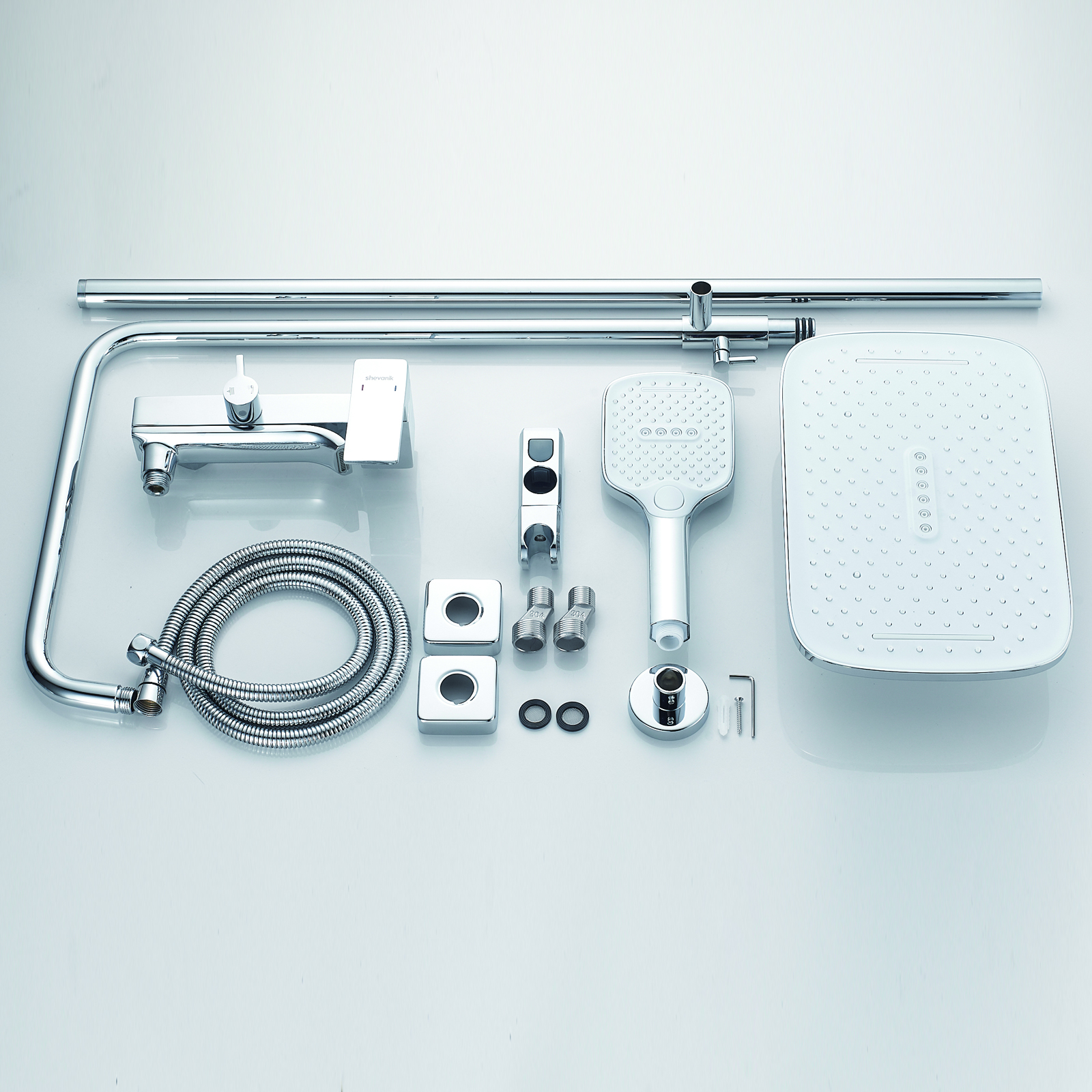 | Комплектация | смеситель, душевая стойка, верхний душ, душевая лейка, душевой шланг, держатель для душевой лейки, настенный держатель, отражатели, эксцентрики |