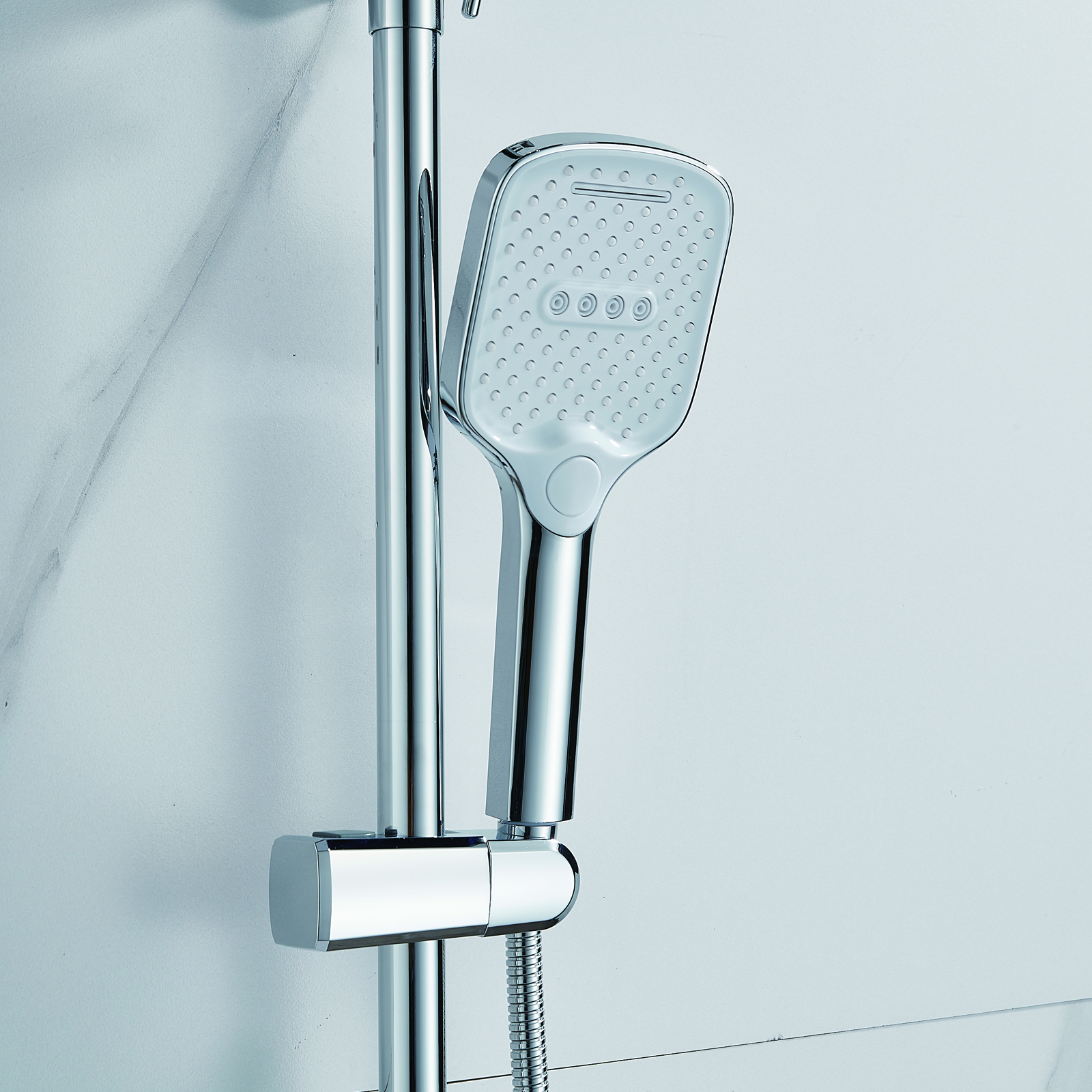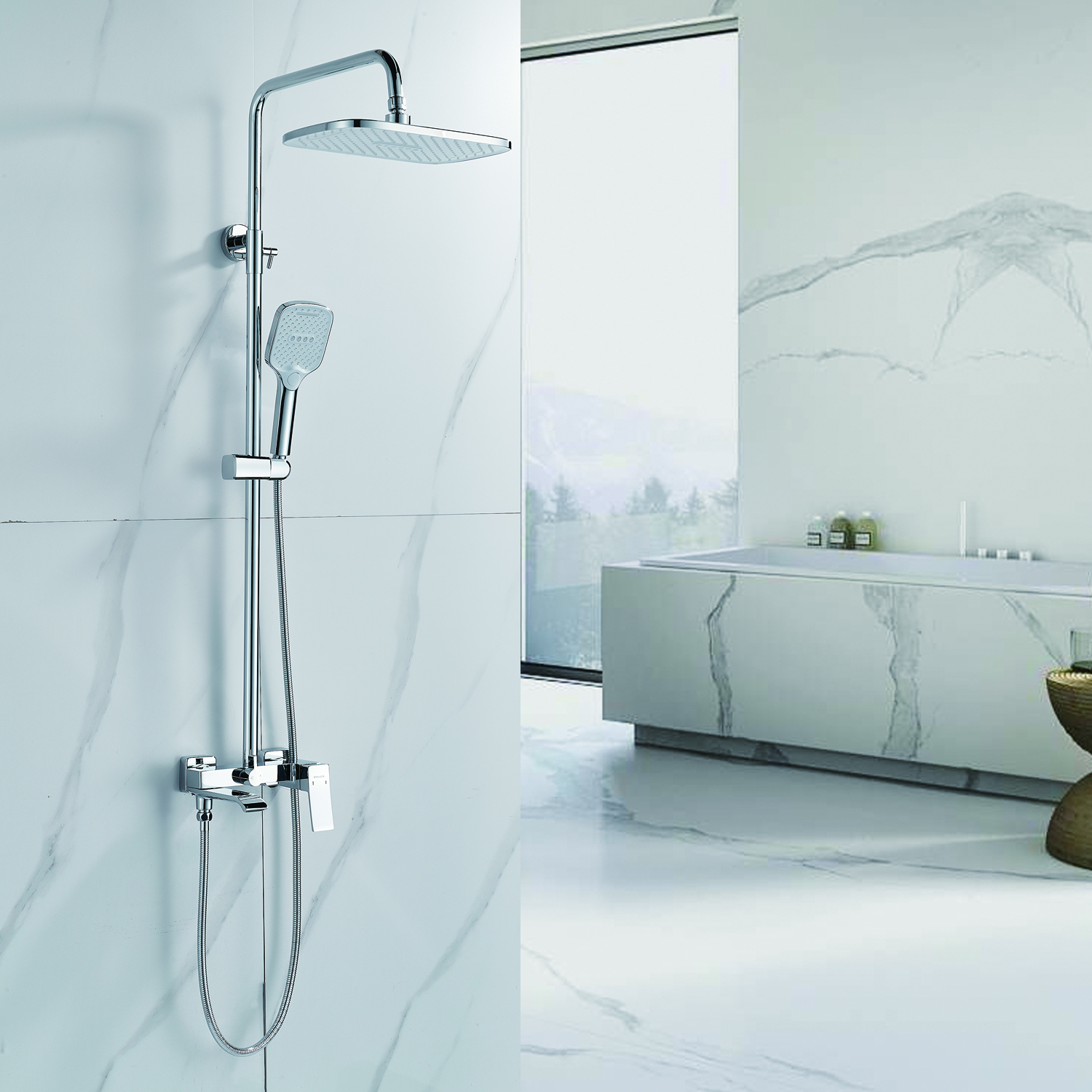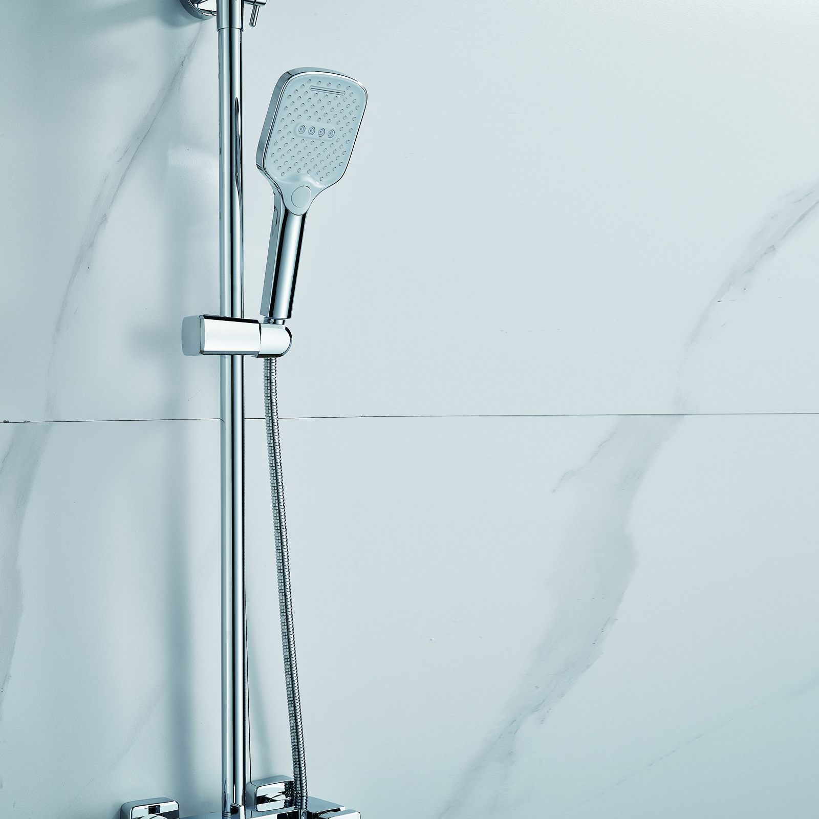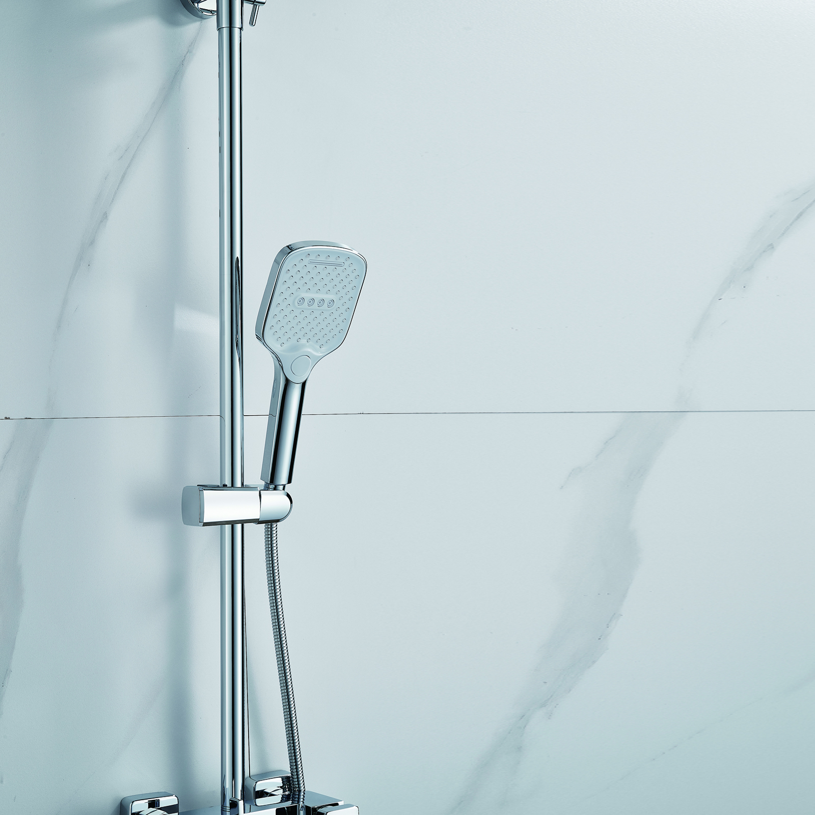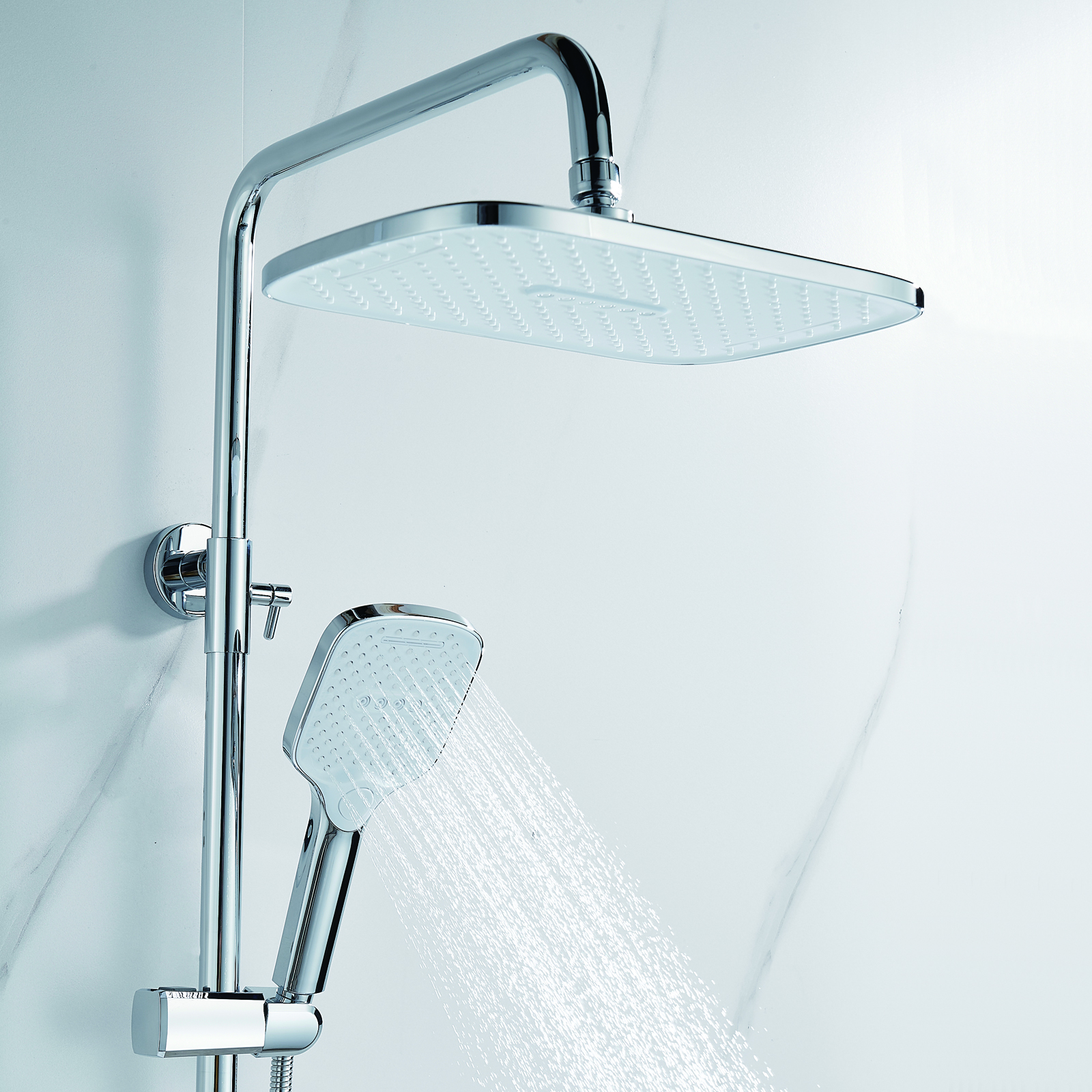 | Комплектация | смеситель, душевая стойка, верхний душ, душевая лейка, душевой шланг, держатель для душевой лейки, настенный держатель, отражатели, эксцентрики |