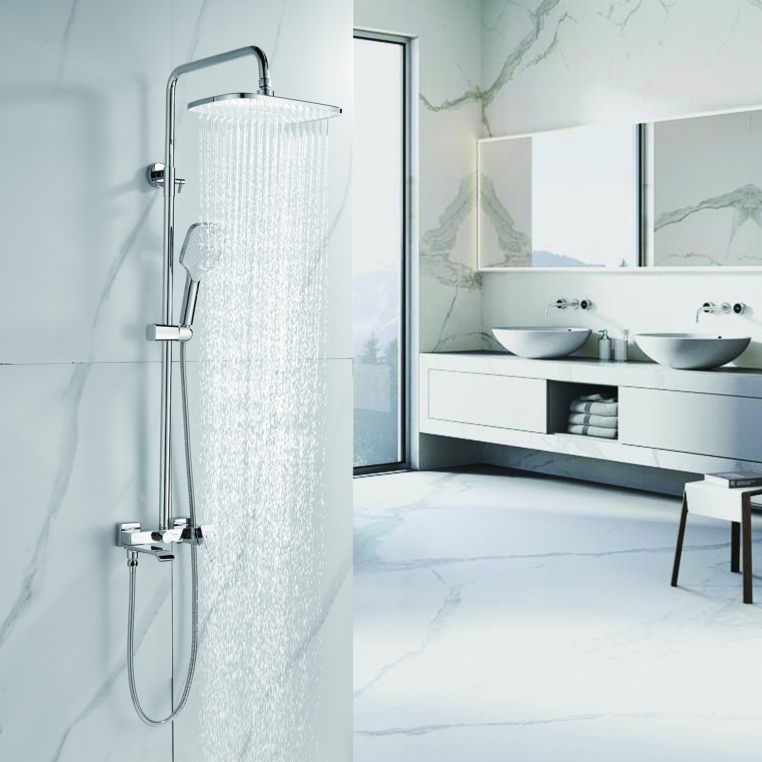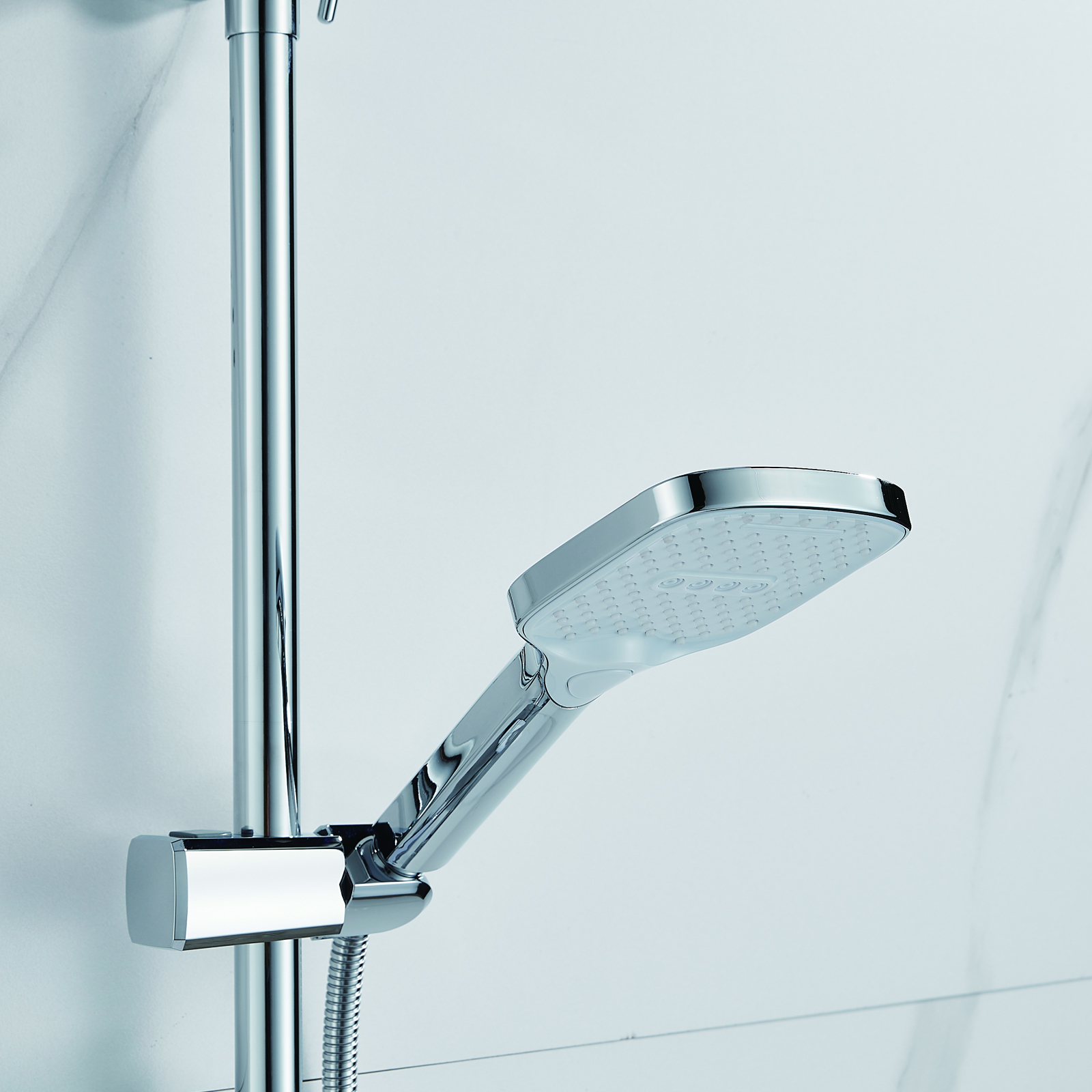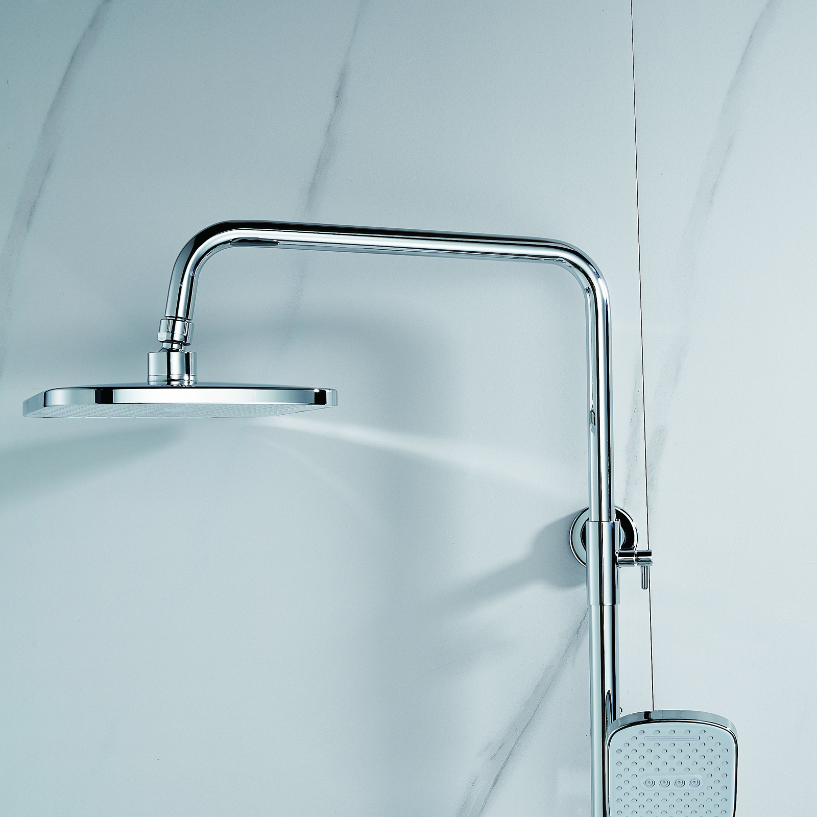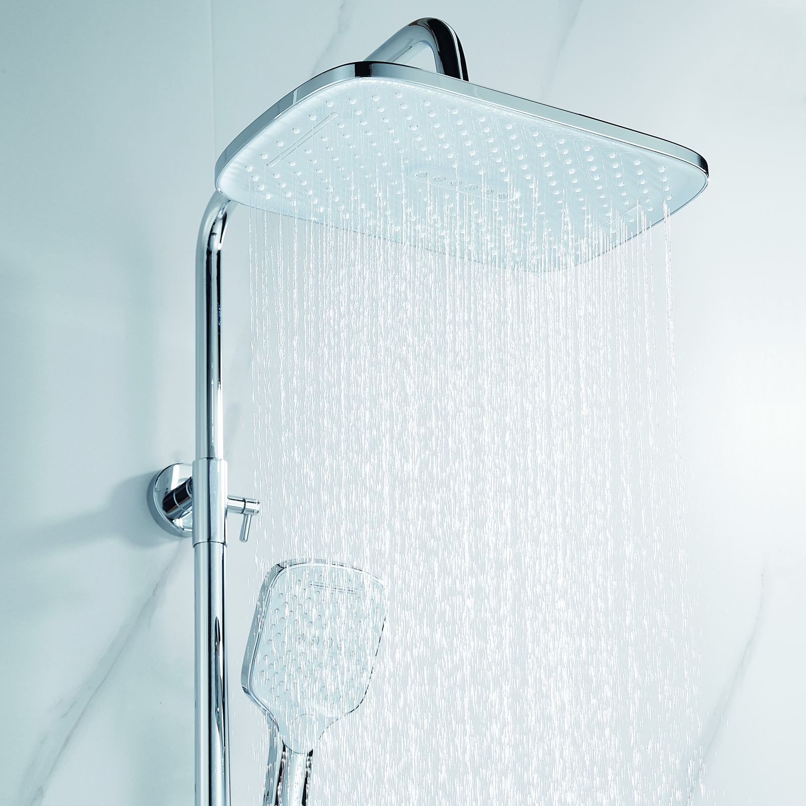 | Комплектация | смеситель, душевая стойка, верхний душ, душевая лейка, душевой шланг, держатель для душевой лейки, настенный держатель, отражатели, эксцентрики |