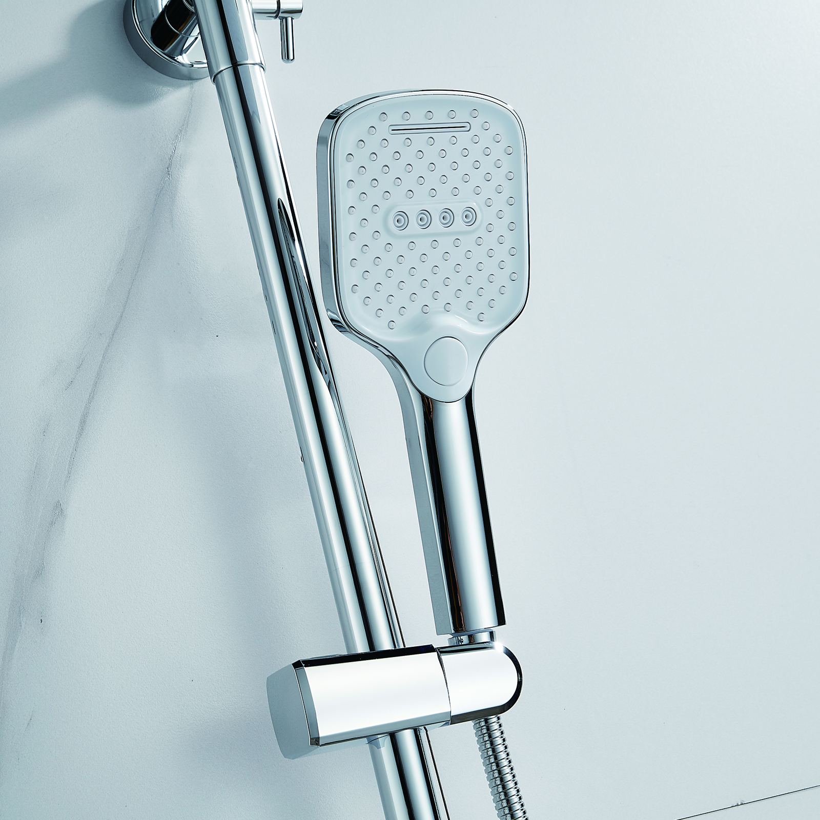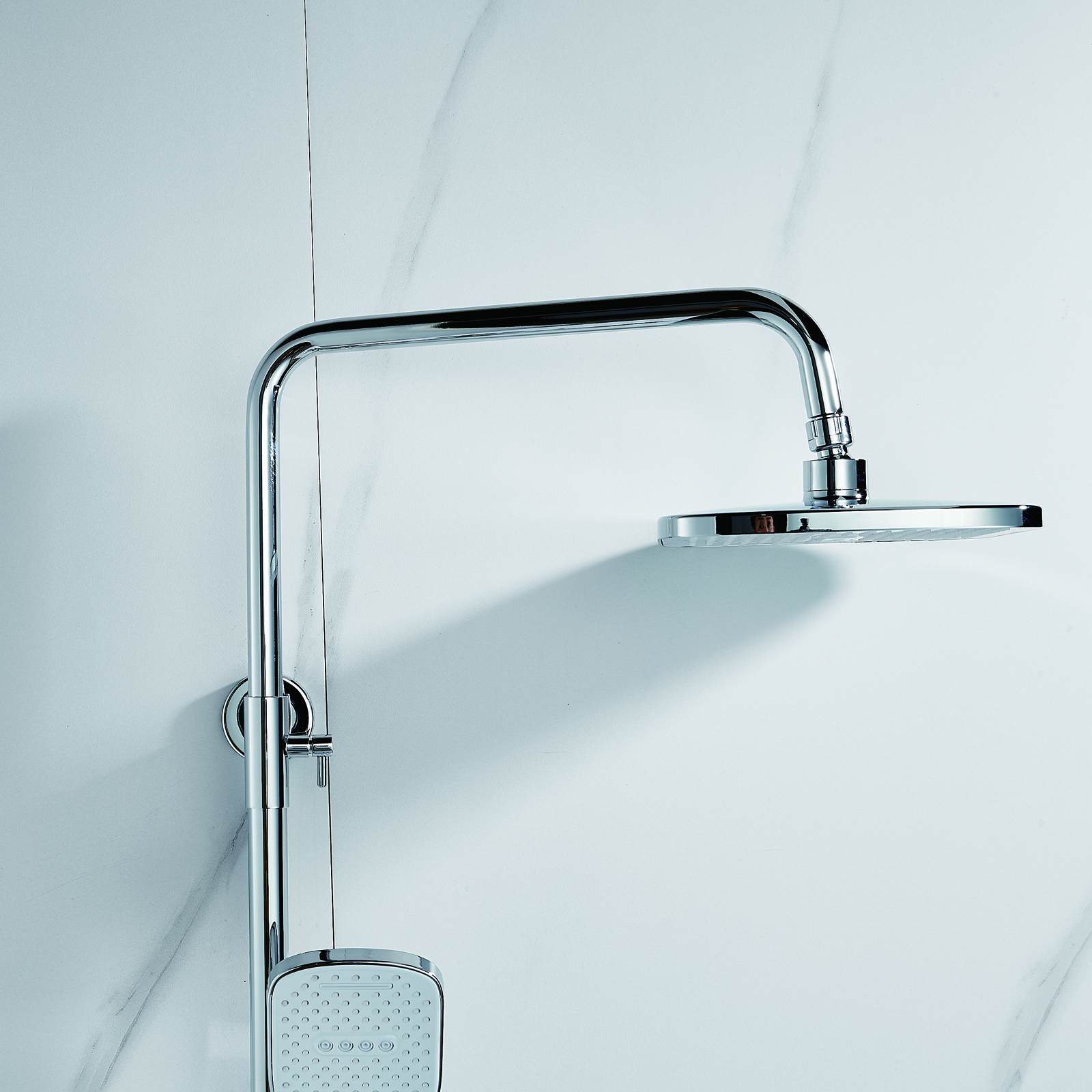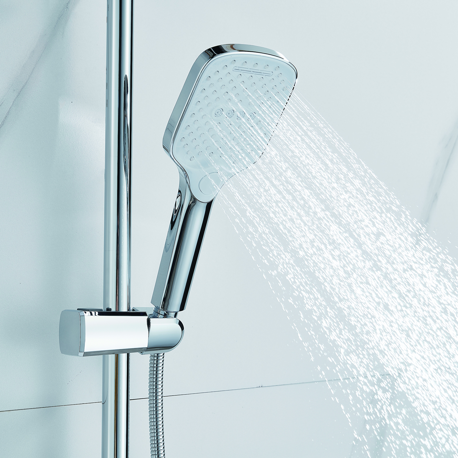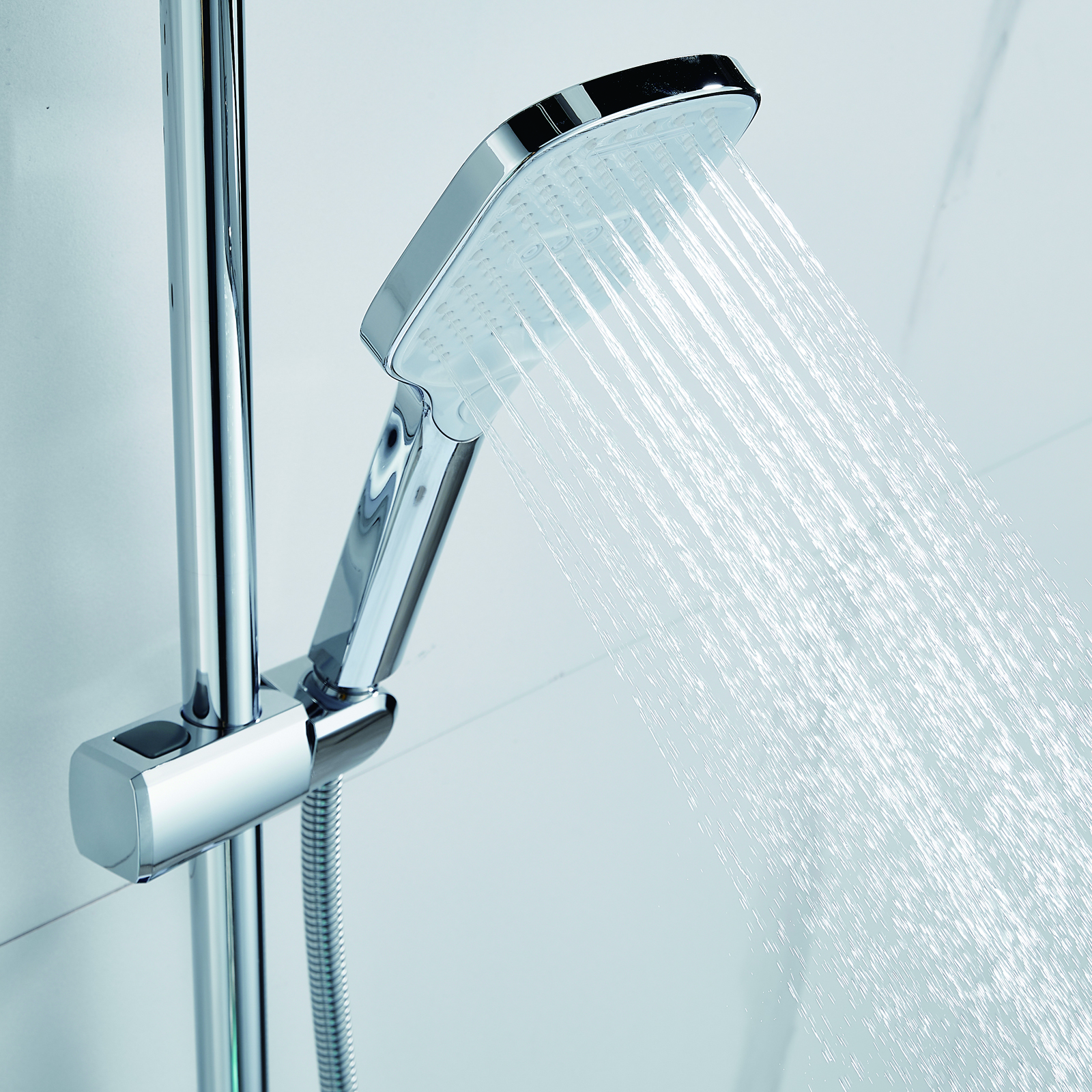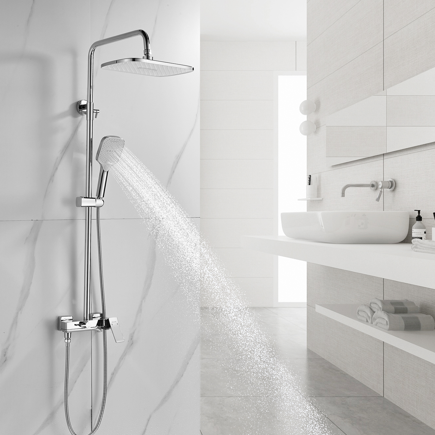 | Комплектация | смеситель, душевая стойка, верхний душ, душевая лейка, душевой шланг, держатель для душевой лейки, настенный держатель, отражатели, эксцентрики |