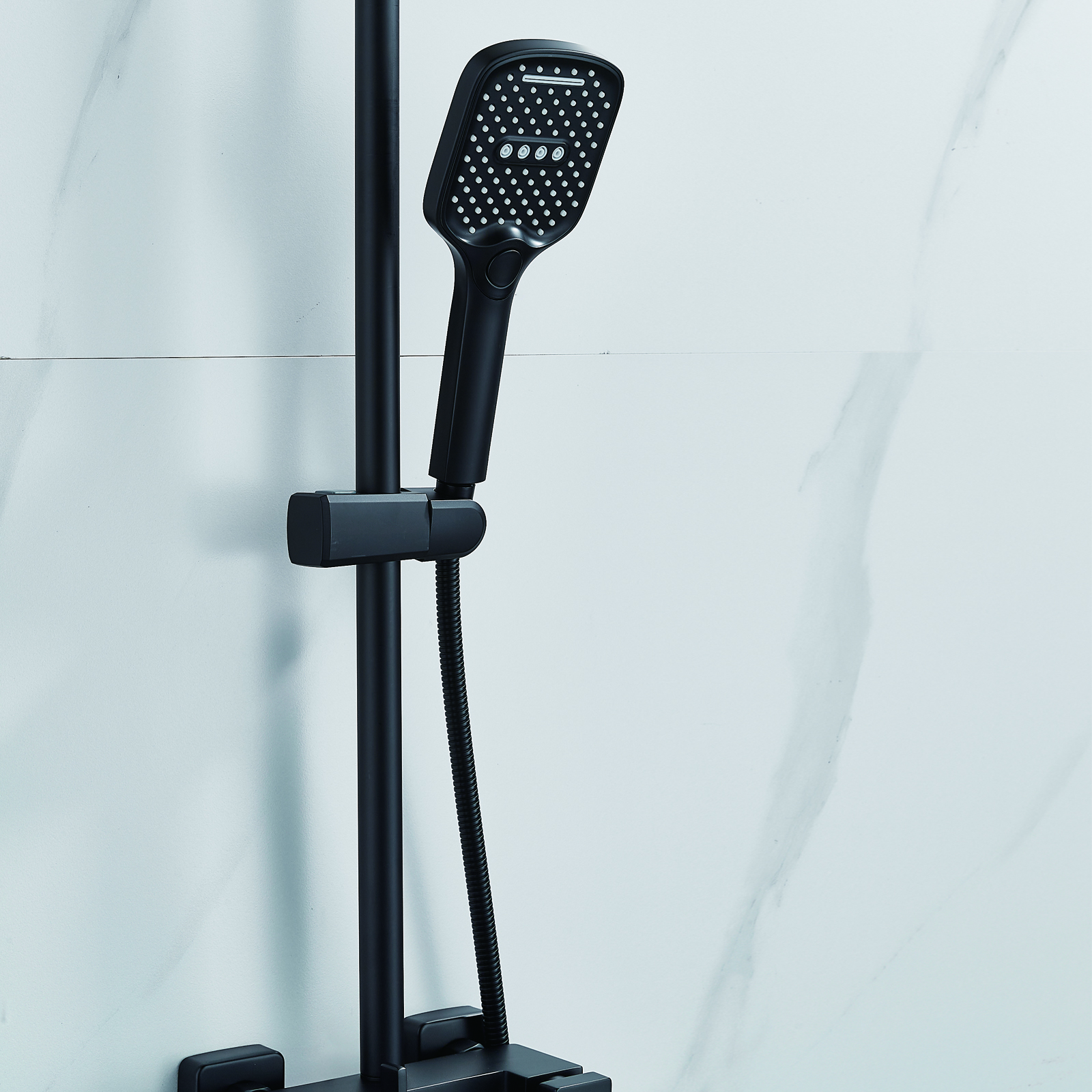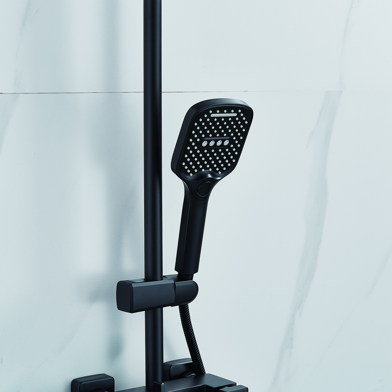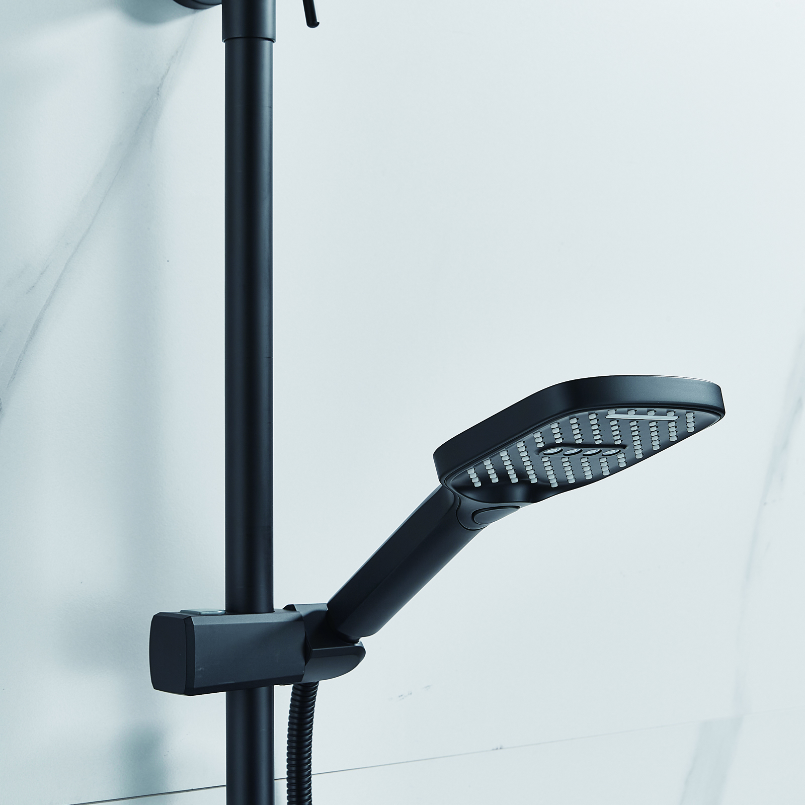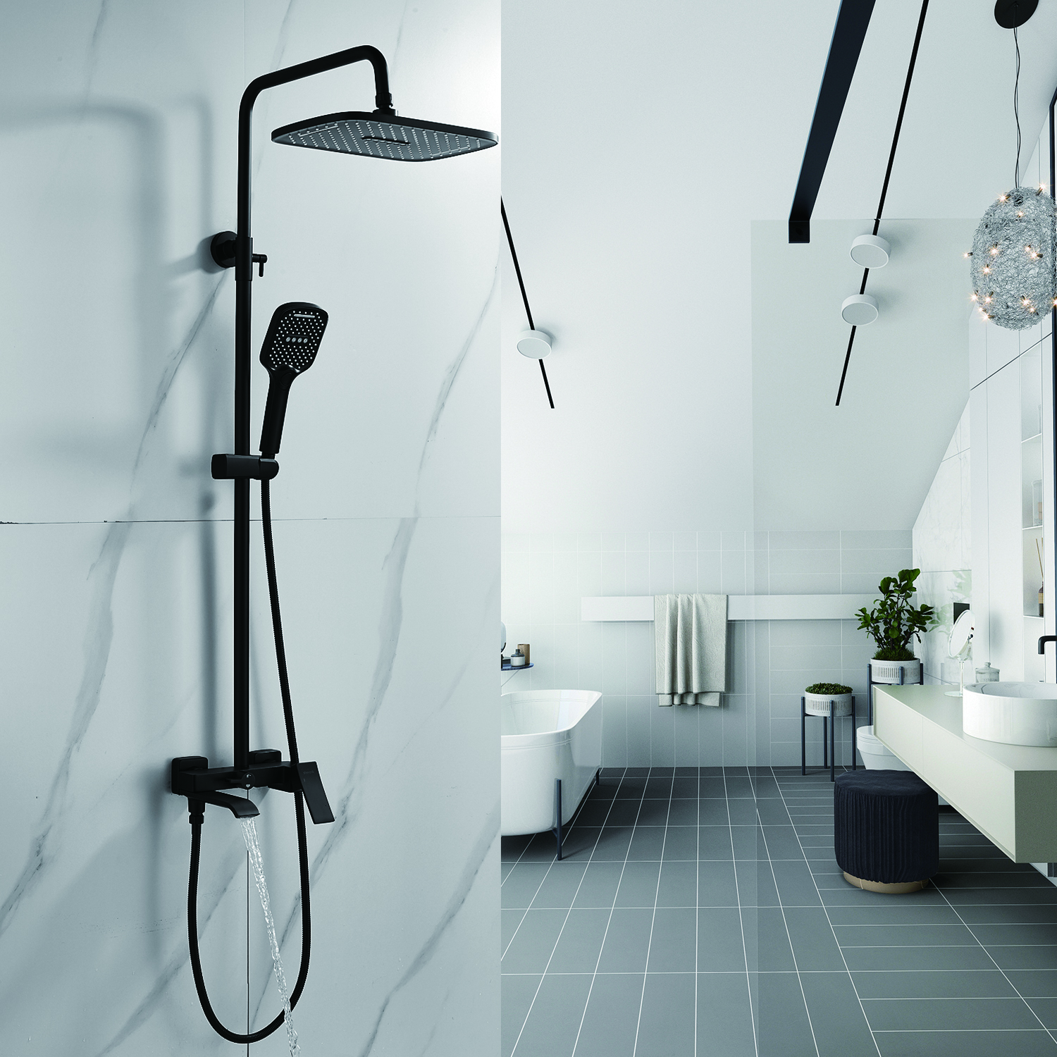 | Комплектация | смеситель, душевая стойка, верхний душ, душевая лейка, душевой шланг, держатель для душевой лейки, настенный держатель, отражатели, эксцентрики |