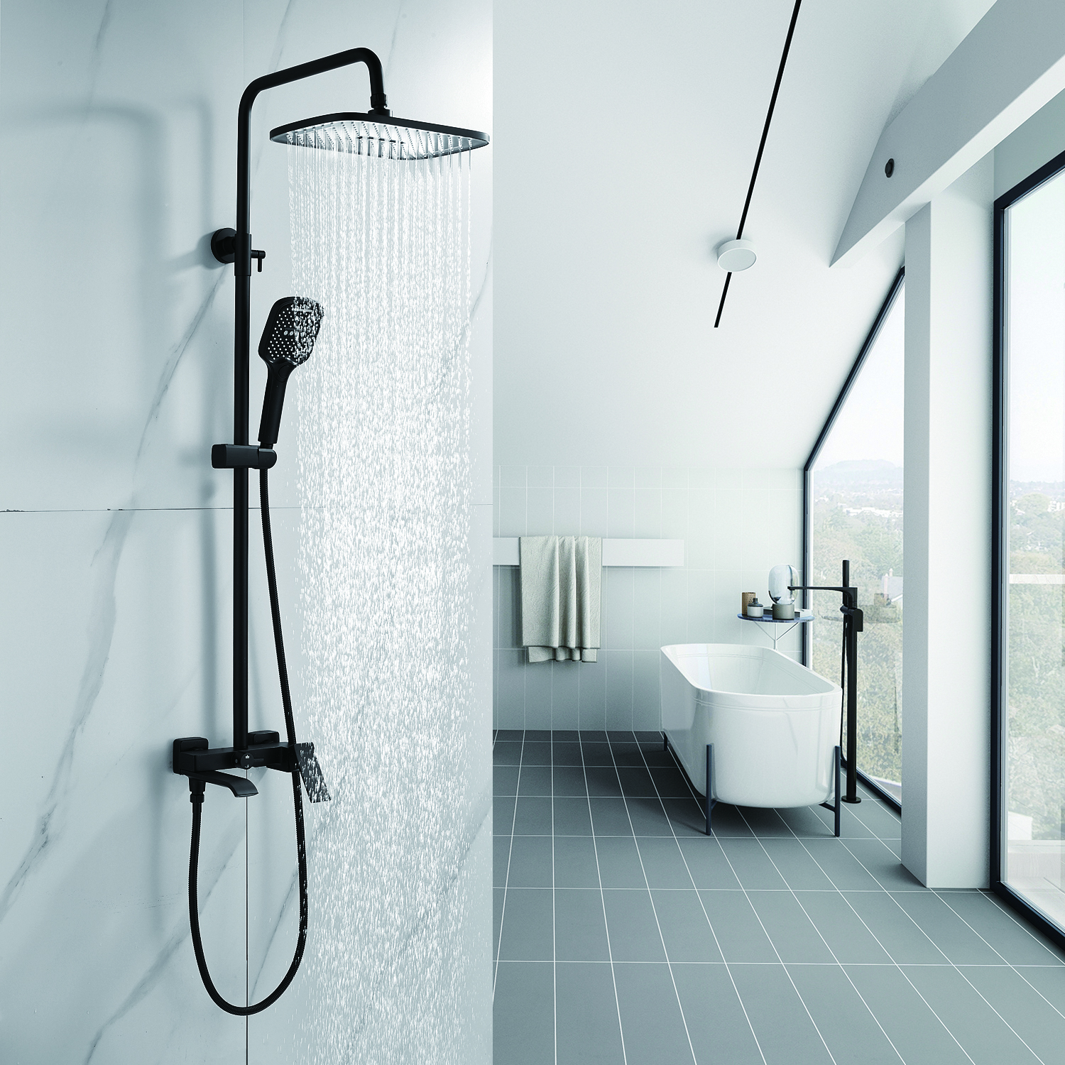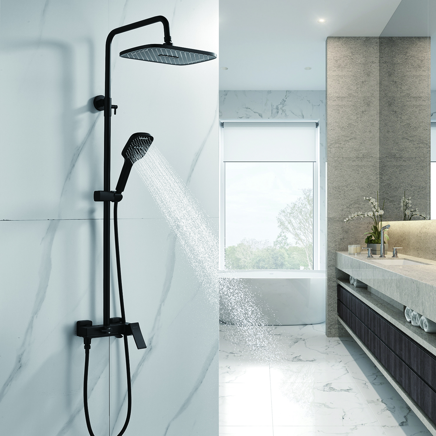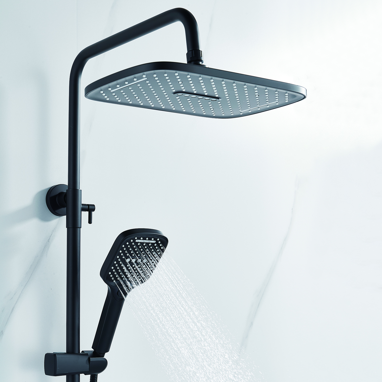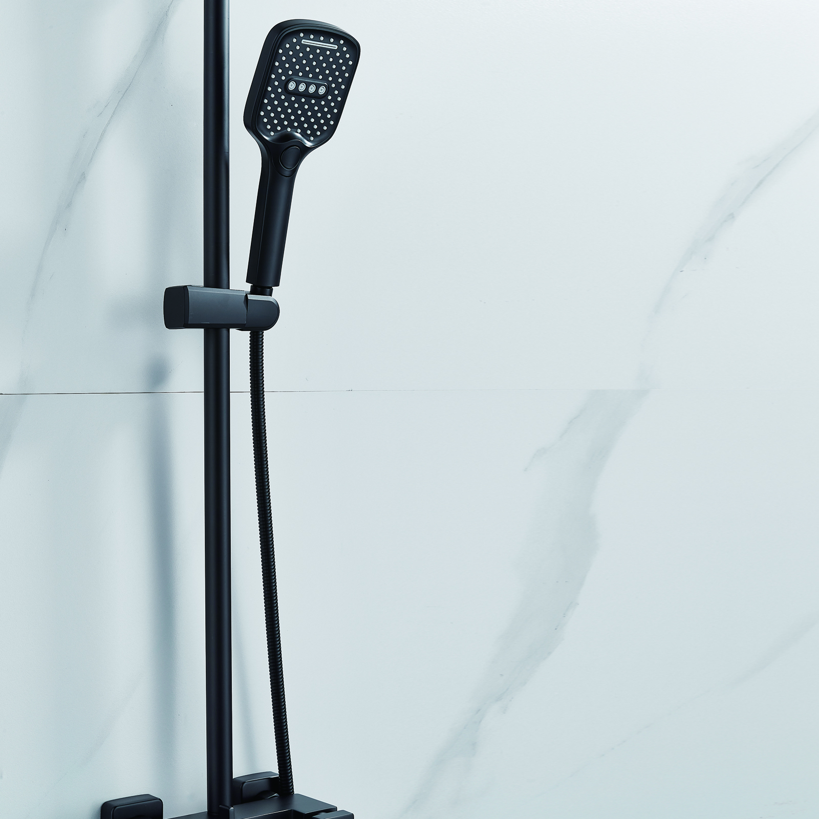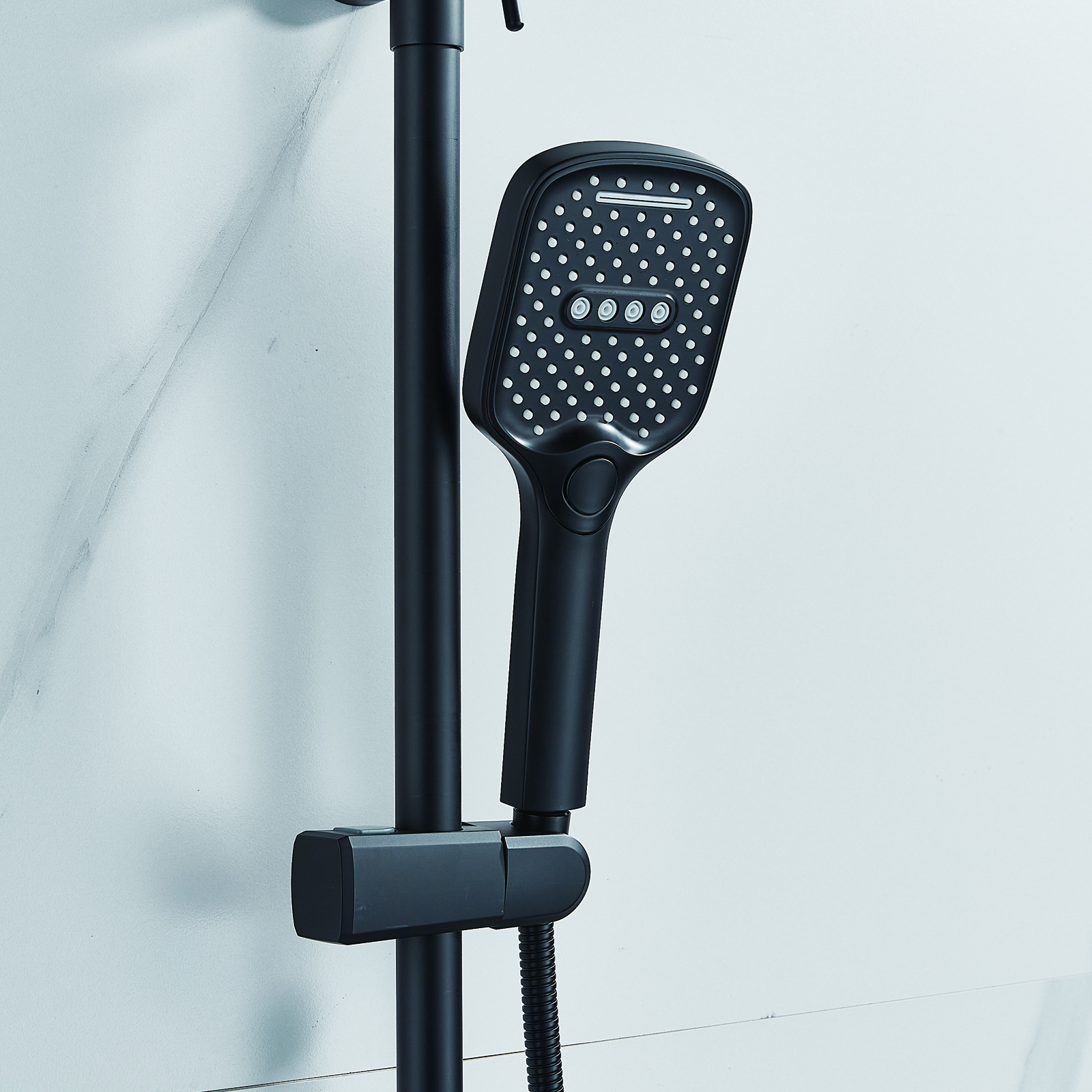 | Комплектация | смеситель, душевая стойка, верхний душ, душевая лейка, душевой шланг, держатель для душевой лейки, настенный держатель, отражатели, эксцентрики |