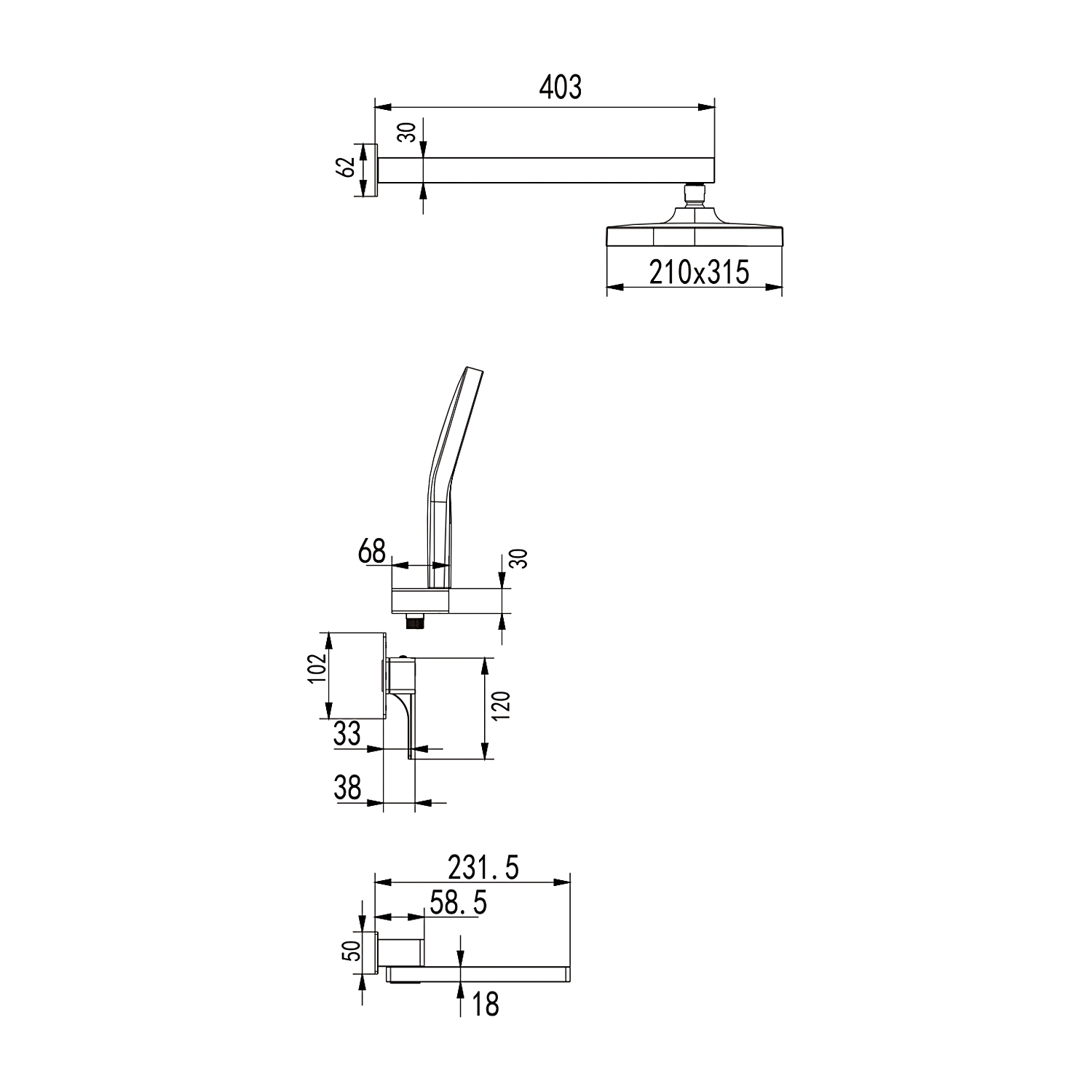 | Комплектация | верхний душ, держатель для душевой лейки, душевая лейка, душевой шланг, излив, кронштейн, наружная часть смесителя, смеситель |